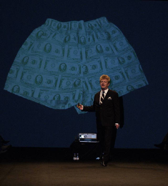 how to create a Brand for your creation or product. Nick Graham spoke to an audience of Editors and Press about the book, from the Runway under The Tents in New York City's Bryant Park. You will find this interesting and funny. When Nick Graham began the session he told us a story of when he first started making men's boxer shorts. He was using an old out of circulation image of a U.S. 500 dollar bill. Men came to his door to confiscate his shorts and ... arrest him. It was the F.B.I. -- they were concerned he was counterfeiting money on the Boxer shorts. They did take his Shorts (inventory). That was how it all began. You could say here the Feds were -Short- sighted. Picture below. |