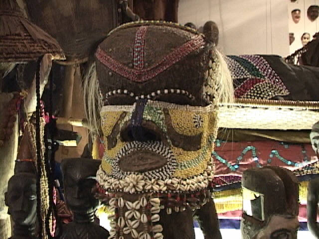 Intricate wood, frabic, and shells face Icon from the Ethnix cultural Art center