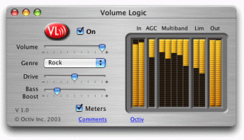 digital remastering for improved quality of sound for iTunes. Volume Logic sells for $19.95 -- available at www.octiv.com This Volume Logic plug-in improves the quality of the listening experience by digitally remastering audio in real time with the same technology used by the pros in the music and broadcast business. All the audio processing takes place while sound is sent to external speakers or headphones. A Mac user's delight. |