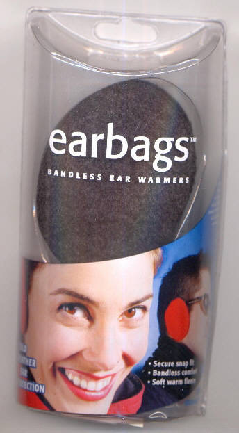 word. Bigtime warm and cozy is what these are. EARBAGS. Earbags have the cure for those drab 1950's style earmuffs. You know, the ones with the Steel band that goes across your head from ear to ear. Earbags get rid of the wire and create a double layered fleece ear warmer that fits gently over each ear like a pair of gloves. At the 2002 Winter Olympics in Salt Lake City, athletes wore them at the opening ceremony. Sold in 3500 sports, outdoor recreation and gift stores including -- Eastern Mountain Sports, REI, Target, Totes Isotoner. www.earbags.com/us |