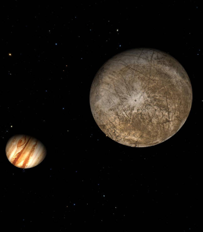 The icy crust of Europa (right) and the planet Jupiter (left).