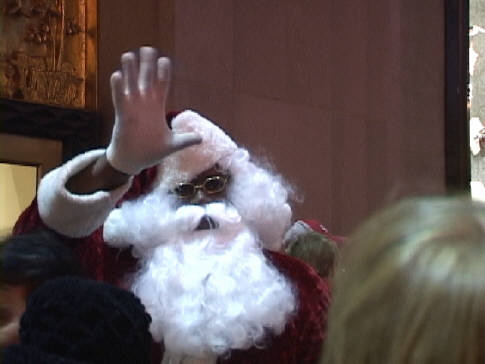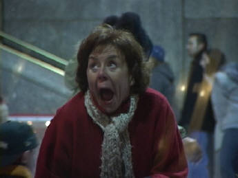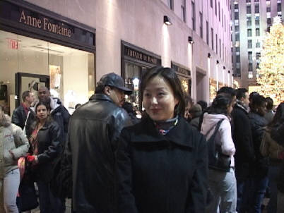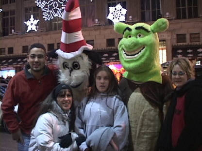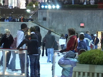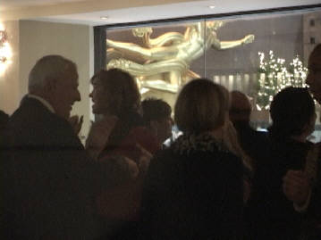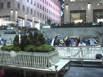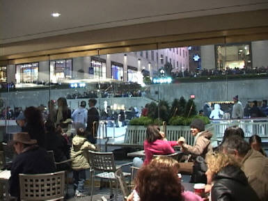 center white lights, that is the Angels in the outdoor Mall - their trumpets raised. The peoples sitting are sitting inside, along the Rockefeller Center Ice Skating Rink. And directly over their head (on the street) is the famed Rockefeller Center Christmas Tree. We are dancing, having a party along side the skating rink at The Sea Grill. See the statue outside through the window ? |