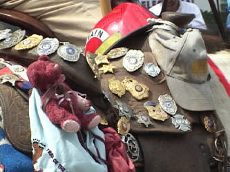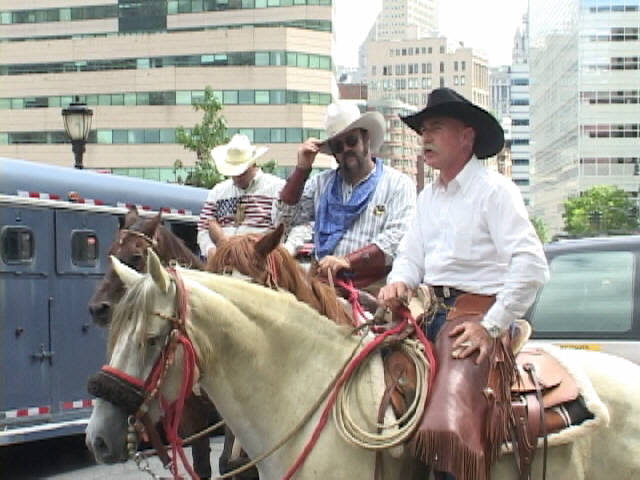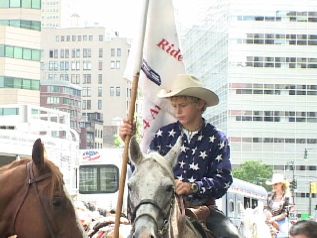 than 50 people on horseback who were escorted into the city by New York City Port Authority Police Officers. The group rode on horseback from the intersection of Murray and West Street to Ground Zero to take part in the 45 minute Event Ceremony ... "Ride 4 America." This Event is: the beginning (the 1st Event ) of a week that marks the one year anniversary of the World Trade Center crumbling