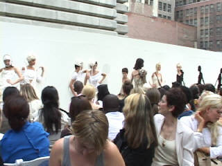 outdoor venue at the Bryant Park Grill, NYC. A long wall was erected with cut outs shaped to the form of each Model's body, clothes, and accessories. Then as it became each one's turn to come alive the Model would come out of the wall on beat of the music and walk the Runway. What is a Fashion Show about ??? It is all about the production. |