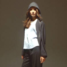 grey zip hooded Jacket, drawstring Pant, and blue sleeveless Blouse by