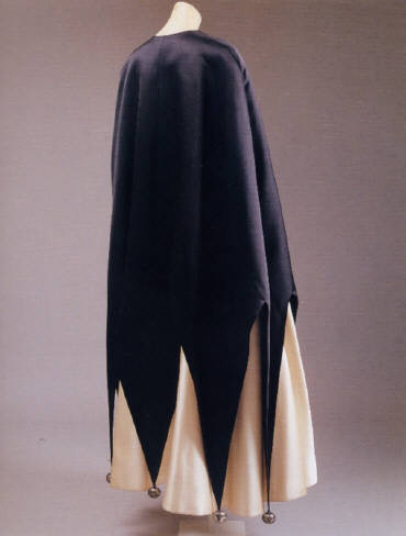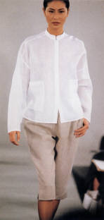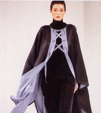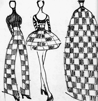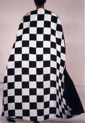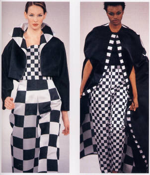 the shapes. Now let's look at The Range. Banded collared shirts, cling to the body sparkle dresses, lace and silk, tops and skirts, pants, sarongs, liquid metal off the shoulder, capes, and jackets. Head to top fashionable dresswear. Our most favorite Yeohlee Designs are when she gets into that mode that takes you into Alice In Wonderland or The Sherwood Forest. Below you can see the checkerboard collection from sketch to finished product. Jacket, Cape, Wide Leg Pant, Cigarette Pant. |